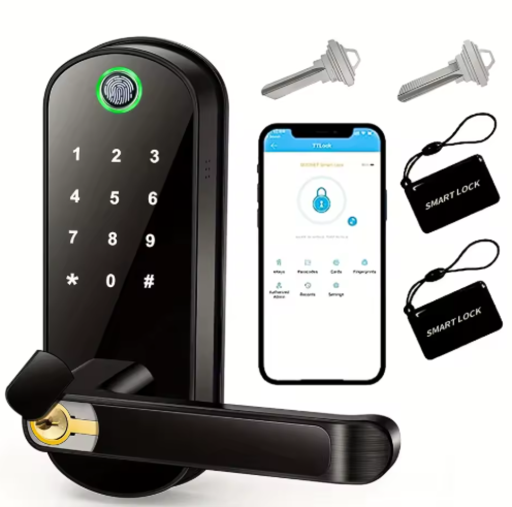 مقبض باب ذكي ببصمة وشاشة لمس مع WiFi مقاوم للماء IP67 يوفر أماناً متقدماً وفتحاً بدون مفتاح. يدعم التحكم عبر التطبيق، تنبيهات البطارية المنخفضة، وبطاقات IC، مع نسخ احتياطية للطاقة عبر USB لتجربة آمنة وذكية لجميع المنازل والمكاتب.